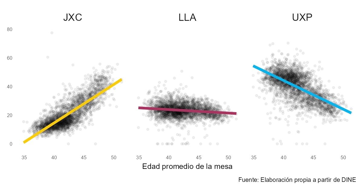 Esto se condice con datos de otros distritos, donde en general los votantes de JxC en promedio son de mayor edad que los de UxP. En el caso de Javier Milei, sus resultados son transversales. No importa el promedio de edad de los votantes de la mesa, el resultado fue similar sin mostrar pendientes destacables a diferencia de los otros espacios.