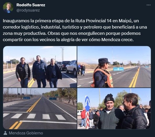 El gobernador Rodolfo Suarez inauguró este viernes la primera etapa de la Ruta Provincial 14, una obra esperada y clave para el sector productivo de Maipú. La inauguración se realizó a dos semanas de las elecciones a intendente en el departamento gobernado por el peronismo y del acto participaron funcionarios y candidatos oficialistas.