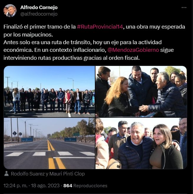 Tras la inauguración, el gobernador Suarez expresó su agradecimiento al actual concejal Pinti Clop que va por la intendencia representando a Cambia Mendoza. "Fue un reclamo permanente, de que teníamos que intervenir esta ruta. Así es que tenés que estar orgulloso, porque sos el artífice de habernos pedido e insistido en esta obra", le manifestó.