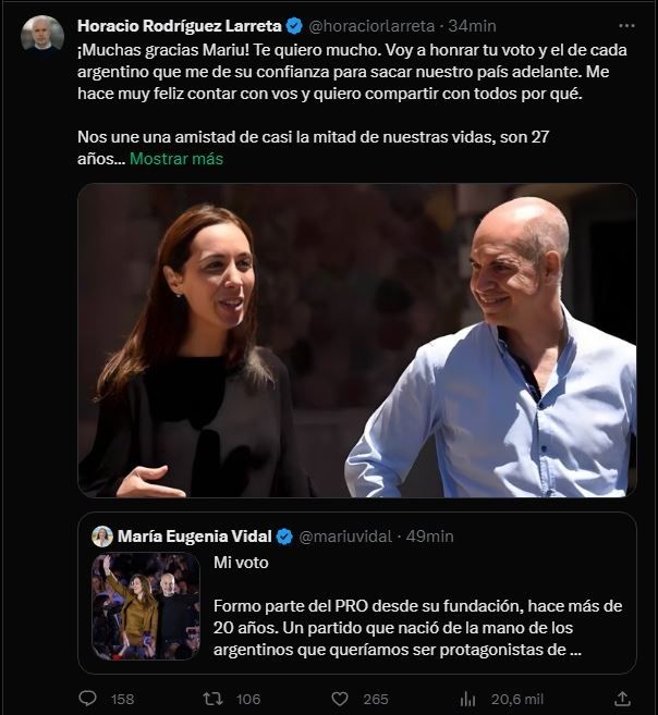 Casi de inmediato, Larreta publicó un posteo de agradecimiento en el cual expresó: "¡Muchas gracias Mariu! Te quiero mucho. Voy a honrar tu voto y el de cada argentino que me de su confianza para sacar nuestro país adelante. Me hace muy feliz contar con vos".