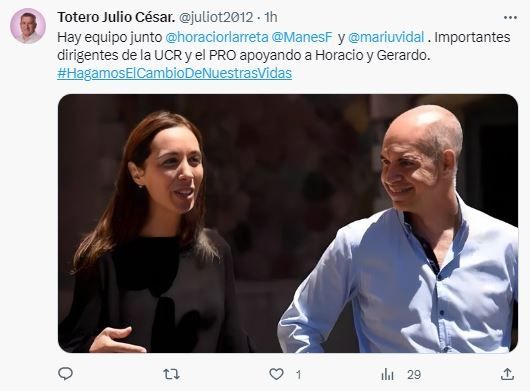 En las redes también salió a celebrar el apoyo de Vidal el dirigente gremial empresario Julio Totero. El referente del Movimiento de Integración y Desarrollo (MID) viene trabajando desde hace tiempo con Rogelio Frigerio y Miguel Ángel Pichetto, alineados internamente con Larreta de cara a las PASO del 13 de agosto.