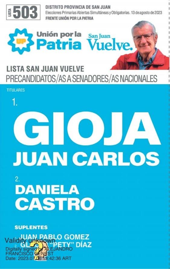 José Luis Gioja es un hombre de amplia trayectoria política dentro del justicialismo, se ha vuelto casi un mito en la política sanjuanina después de sobrevivir a un accidente en helicóptero. Quizá, eso podría justificar que su imagen esté en las boletas, aunque no participe en el comicio y el precandidato sea su hermano.