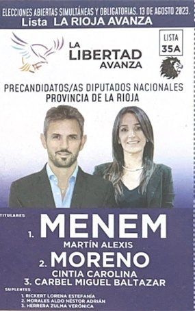 La batalla de los Menen se dará en La Rioja. Carlos Alberto Menem irá por el Partido Proyecto Joven como precandidato a parlamentario del Mercosur. Mientras que Martín Menem, va como precandidato a diputado nacional en el mismo distrito por La Libertad Avanza, el espacio que lidera Javier Milei.