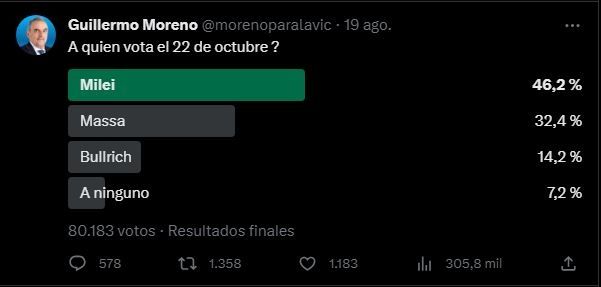 El ex precandidato presidencial peronista preguntó en su cuenta de Twitter: "¿A quién vota el 22 de octubre?". Pero las respuestas obtenidas por Guillermo Moreno no eran las esperadas. El 46,2% se inclinó por Javier Milei mientras que 32,4% lo hizo por Massa y apenas el 14,2% por Patricia Bullrich.