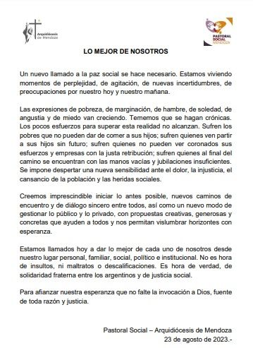 Desde el arzobispado de Mendoza insistieron en que “las expresiones de pobreza, de marginación, de hambre, de soledad, de angustia y de miedo van creciendo. Tememos que se hagan crónicas”.