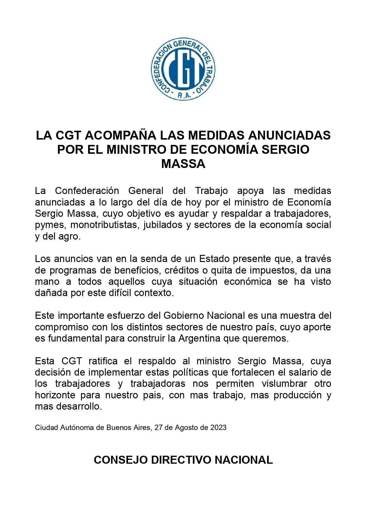 El consejo directivo nacional de la central sindical emitió un comunicado titulado "La CGT acompaña las medidas anunciadas por el ministro de Economía Sergio Massa" poco después de que el funcionario hiciera una serie de anuncios para diversos sectores sociales.