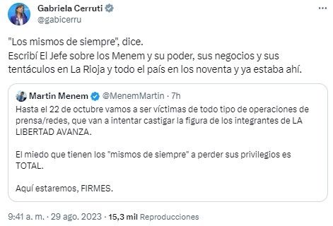 "'Los mismos de siempre', dice", sostuvo la portavoz presidencial en tono irónico. "Escribí El Jefe sobre los Menem y su poder, sus negocios y sus tentáculos en La Rioja y todo el país en los noventa y ya estaba ahí", completó en referencia a la gestión del exmandatario.