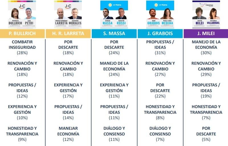 Patricia Bullrich se destaca en el combate a la inseguridad, el voto por descarte se hace presente tanto para Horacio Rodríguez Larreta como para Sergio Massa, Juan Grabois lidera con sus propuestas e ideas, y Javier Milei destaca por el manejo de la economía.