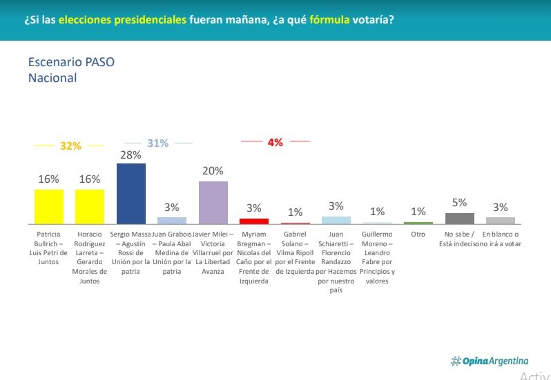En la encuesta que cerró el pasado martes tanto Horacio Rodríguez Larreta como Patricia Bullrich alcanzan 16% de intención de voto frente al 28% de Sergio Massa y 3% de Juan Grabois. La sumatoria da 32% de intención de voto para Juntos por el Cambio y 31% para Unión por la Patria.