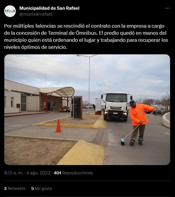 Por su parte, Casado dijo: “Cualquiera que use la terminal sabe y ha visto las condiciones en las que se encuentra desde su inauguración. La verdad que nunca funcionó bien y siempre funcionó con mala atención a los visitantes siendo que muchos turistas llegan a San Rafael a través de esta terminal. Lo que no hicieron en 20 años lo quieren hacer ahora por eso ahora bajan la licitación y la municipalidad -un mes antes de las elecciones- se va a hacer cargo de la terminal”.