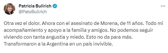 "Debido a los tristes hechos de público conocimiento, enviamos nuestras condolencias y solidaridad a la familia y amigos de Morena. Hemos decidido suspender el acto de cierre de campaña en la Provincia de Buenos Aires previsto para mañana", expresó el jefe de campaña de Bullrich, Juan Pablo Arenaza.