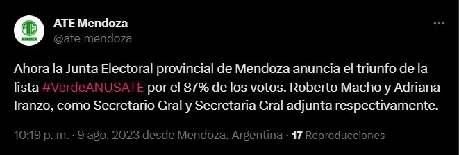"Ahora la Junta Electoral provincial de Mendoza anuncia el triunfo de la lista #VerdeANUSATE por el 87% de los votos. Roberto Macho y Adriana Iranzo, como Secretario Gral y Secretaria Gral adjunta respectivamente", confirmaron desde ATE este miércoles por la noche.