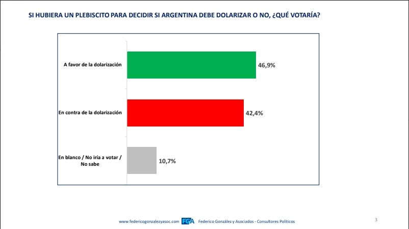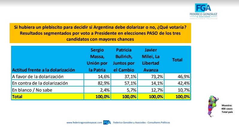 De acuerdo a la encuesta de la consultora de Federico González, existe una nueva grieta a partir de la propuesta de Javier Milei de eliminar el peso, el Banco Central y pasar a dolarizar la economía. La iniciativa del candidato de La Libertad Avanza para que el dólar sea la moneda oficial de la Argentina obtendría 46,9% de adhesión entre los votantes.
