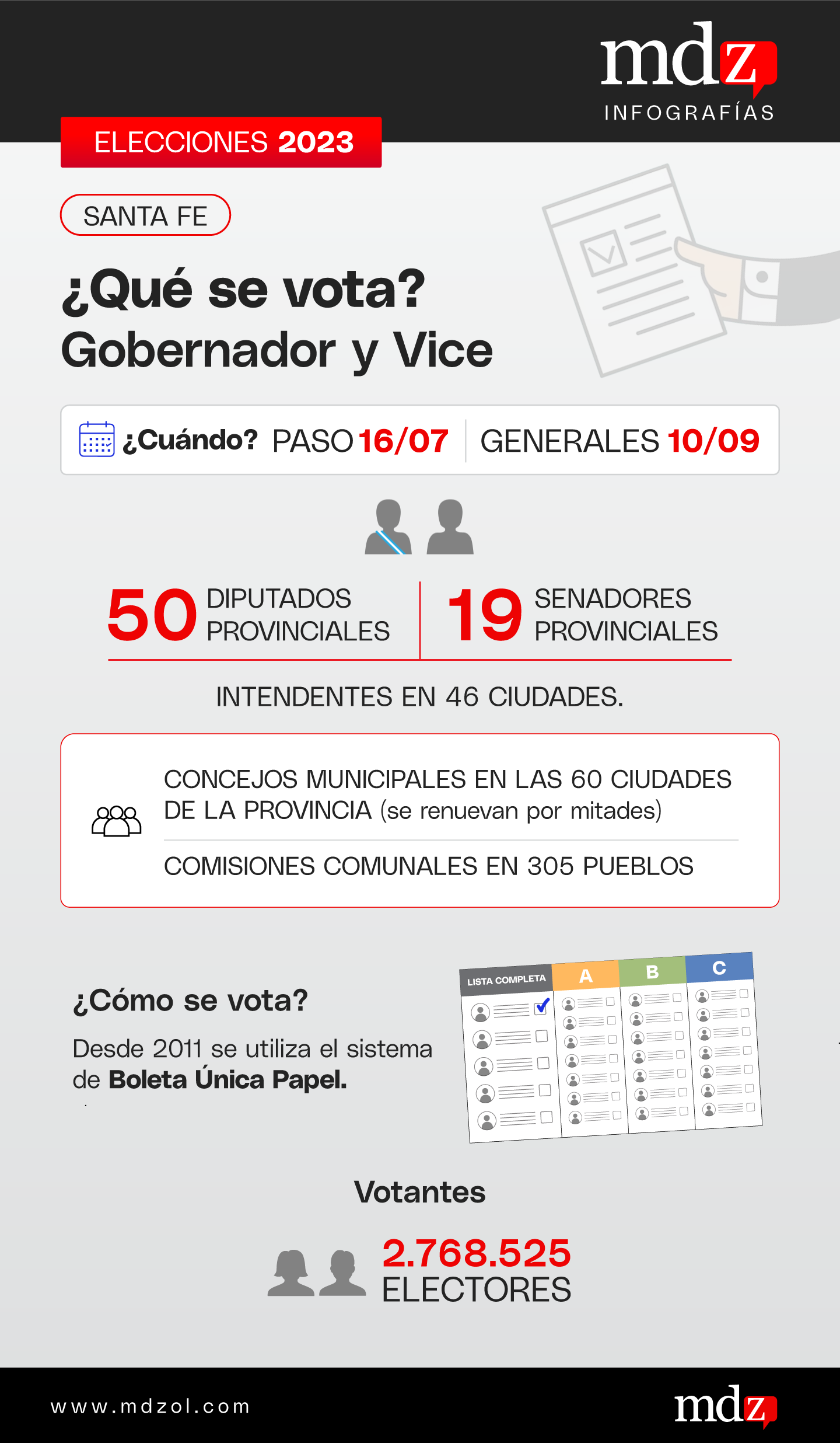 De acuerdo a la información oficial del Tribunal Electoral Provincial, en esta oportunidad son 2.840.878 santafesinos distribuidos en los 19 departamentos que están en condiciones de ir a las urnas. Este año Santa Fe incorporó el Voto Joven y más de 84 mil chicos y chicas, de 16 y 17 años, están en condiciones de sufragar de forma optativa.