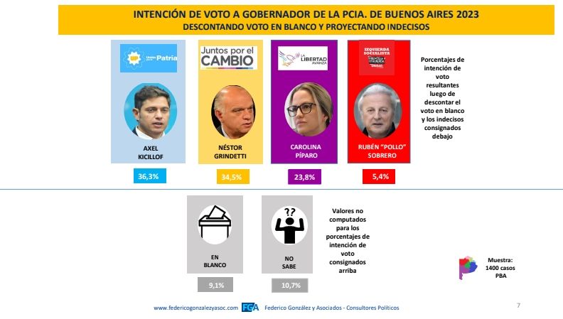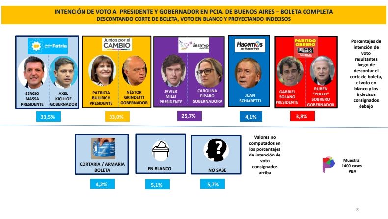 La encuesta de la consultora de Federico González midió dos escenarios en la provincia de Buenos Aires. El primero, con boleta larga, incluído el tramo presidencial, y descontando corte de boleta, voto en blanco y proyección de indecisos. La papeleta de Unión por la Patria con Sergio Massa y Axel Kicillof llegaría al 33,5% de los votos, apenas unas décimas por encima de Patricia Bullrich y Néstor Grindetti quienes empujarían la boleta de Juntos por el Cambio hasta el 33% de los votos. En tercer lugar, aparece la oferta bonaerense de La Libertad Avanza, con Javier Milei y Carolina Píparo arañando 25,7% de los sufragios.