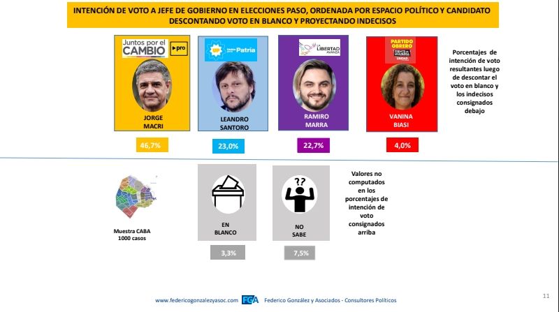 En la encuesta de la consultora Federico González y Asociados, Jorge Macri alcanza una intención de voto del 46,7%, a menos de 4 puntos de poder ganar en primera vuelta. Segundo aparece Leandro Santoro con 23%, prácticamente igualado a Ramiro Marra, quien lograría 22,7% de los votos. Última aparece Vanina Viasi del Partido Obrero con 4%.