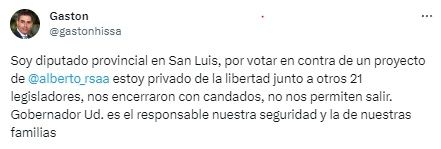 "Soy diputado provincial en San Luis, por votar en contra de un proyecto de Alberto Rodríguez Saá estoy privado de la libertad junto a otros 21 legisladores”, expresó uno de los diputados que estuvo en la Legislatura, Gastón Hissa.