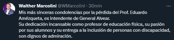 El actual intendente alvearense Walther Marcolini confirmó la lamentable noticia a través de sus redes sociales. "Mis más sinceras condolencias por la pérdida del Prof. Eduardo Amézqueta, ex intendente de General Alvear. Su dedicación incansable como profesor de educación física, su pasión por sus alumnos y su entrega a la inclusión de personas con discapacidad, son dignos de admiración", expresó.