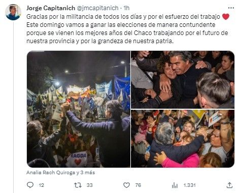 Sobre el final, Capitanich definió al acto como "el último" en su lugar de "candidato a Gobernador de la provincia" ya que "el próximo domingo seré elegido gobernador por el pueblo del Chaco por los próximos cuatro años”. “Cuando nos dicen que somos la provincia pobre, reconocemos nuestra pobreza material, pero no la pobreza espiritual, del amor y el trabajo”, cerró.