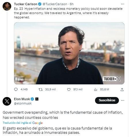 Fue otra vez como respuesta a una publicación de Carlson, quien aseguró mediante un video: “La hiperinflación y una política monetaria imprudente pronto podrían devastar la economía global. Viajamos a Argentina, donde ya pasó”.