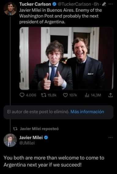 En ese contexto, Carlson publicó una imagen junto a Milei describiendo al candidato libertario como "enemigo del Washington Post y probablemente el próximo presidente de Argentina".
