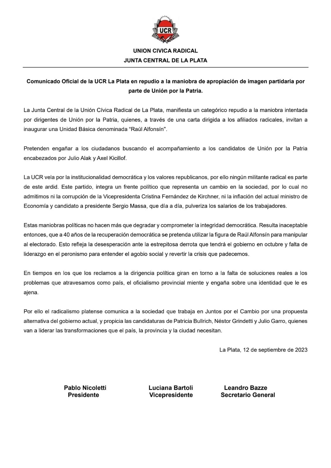 "Repudiamos la maniobra de apropiación de imagen partidaria por parte de Unión por la Patria", criticó la sede radical en la ciudad platense, mediante un comunicado.