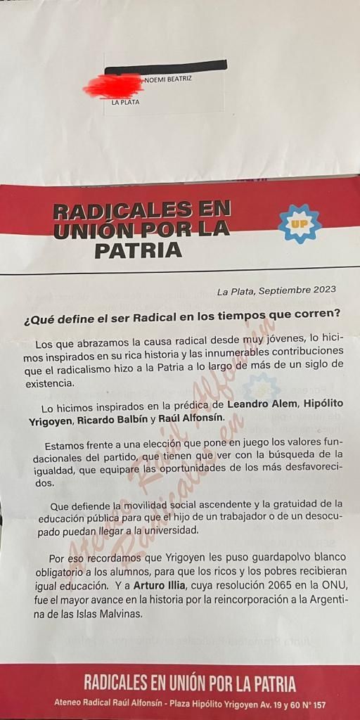 En el Comité provincial de la UCR, el desfile de boinas blanca platenses con carta en mano preguntando de qué se trataba eso era incesante. Algunos acusaban a un exdirigente - que pegó el portazo hace unos años - de haber filtrado el padrón de afiliados. La queja más recurrente, además de la utilización del nombre y la imagen de uno de los emblemas del radicalismo como es el expresidente Raúl Alfonsín, tenía que ver con un detalle en el sobre que llamó la atención de todos.