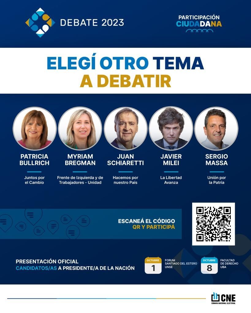 El debate presidencial 2023 se caracterizará por tener una novedosa característica. La participación ciudadana será adoptada en el debate, cosa que nunca antes se había implementado. La gente va a poder votar y definir temas de los cuales van a tener que fijar posiciones los cinco candidatos: Javier Milei, Patricia Bullrich, Sergio Massa, Juan Schiaretti y Myriam Bregman.