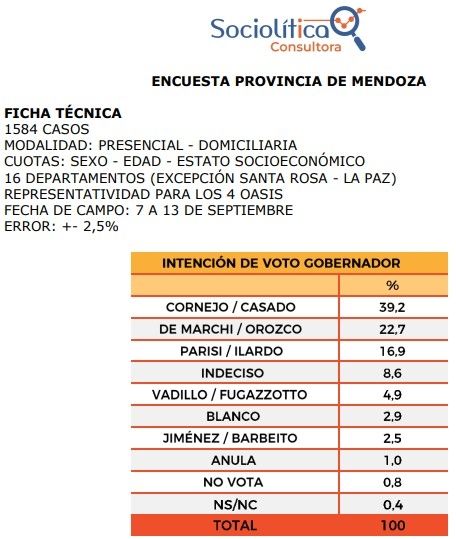 El resultado arrojó un 36% de intención de voto para Cornejo y un 33% para De Marchi, siendo una diferencia más pareja de la registrada en agosto por la misma consultora, que marcaba una ventaja de 7 puntos a favor del radical.