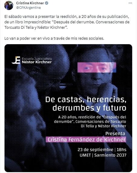 “El sábado vamos a presentar la reedición, a 20 años de su publicación, de un libro imprescindible: ´Después del derrumbe. Conversaciones de Torcuato Di Tella y Néstor Kirchner´, señaló en la red social conocida anteriormente como Twitter. Además, confirmó que el evento podrá ser visto a través de sus redes sociales.