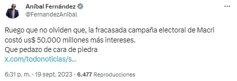 Tras estas declaraciones, Aníbal Fernández salió a contestarle en la red social X. "Ruego que no olviden que la fracasada campaña electoral de Macri costó usd$ 50.000 millones más intereses", lanzó el ministro de Seguridad. Y sentenció sin vueltas: "Que pedazo de cara de piedra".
