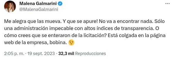 Tampoco se limitó a insultar a un usuario que le advirtió que el abogado Ariel Lijo "movería las causas". Malena Galmarini le respondió que le alegraba que las causas se muevan, anticipando de que "no encontraría nada", porque es una "administración impecable con altos índices de transparencia". Le aclaró que la licitación está en la página, y terminó el tuit con un insulto: "bobina".