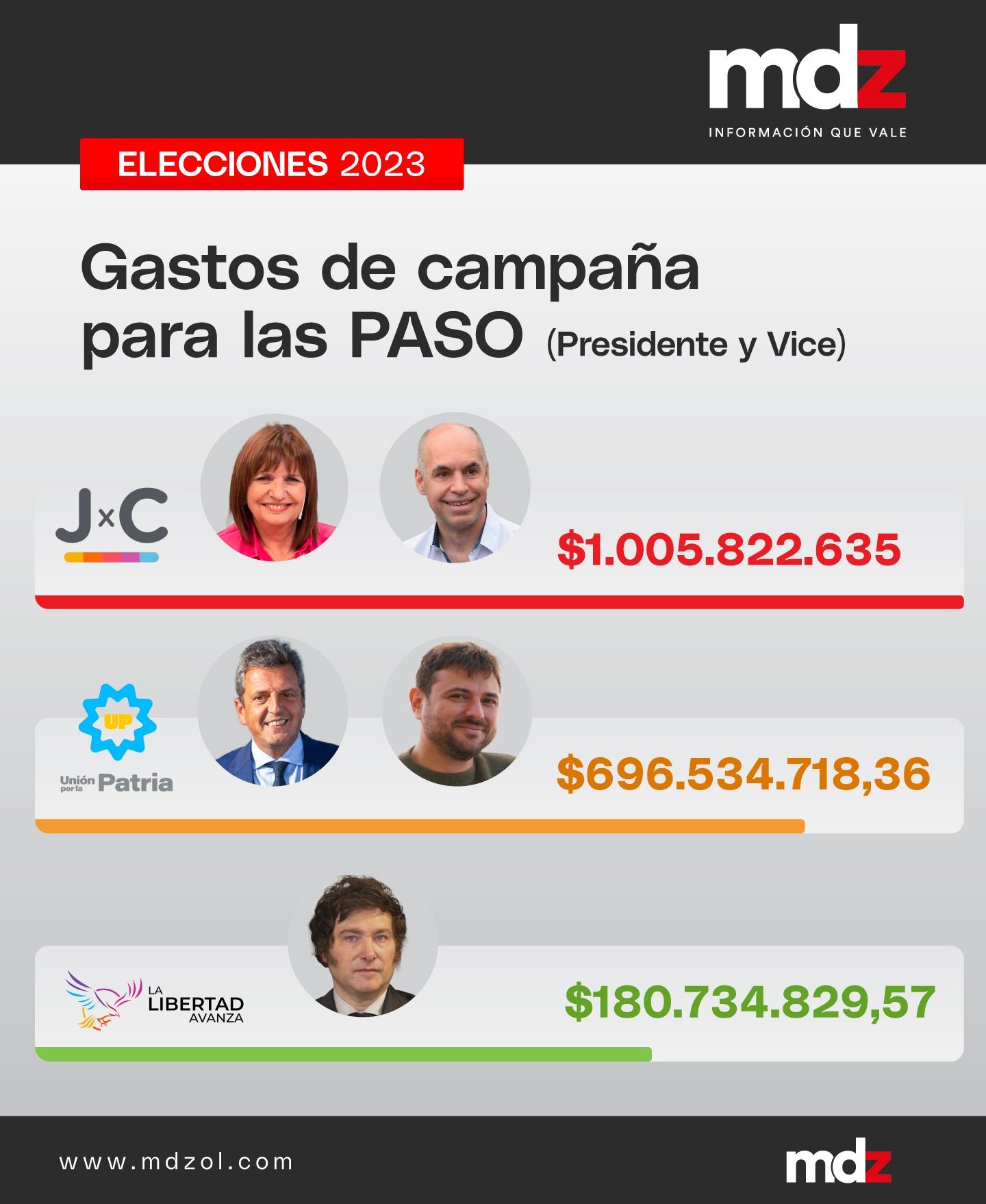 En total, Juntos por el Cambio gastó en la sumatoria de sus dos candidatos $1.005.822.635; Unión por la Patria llegó a $696.534.718; mientras que La Libertad Avanza totalizó $180.734.829.
