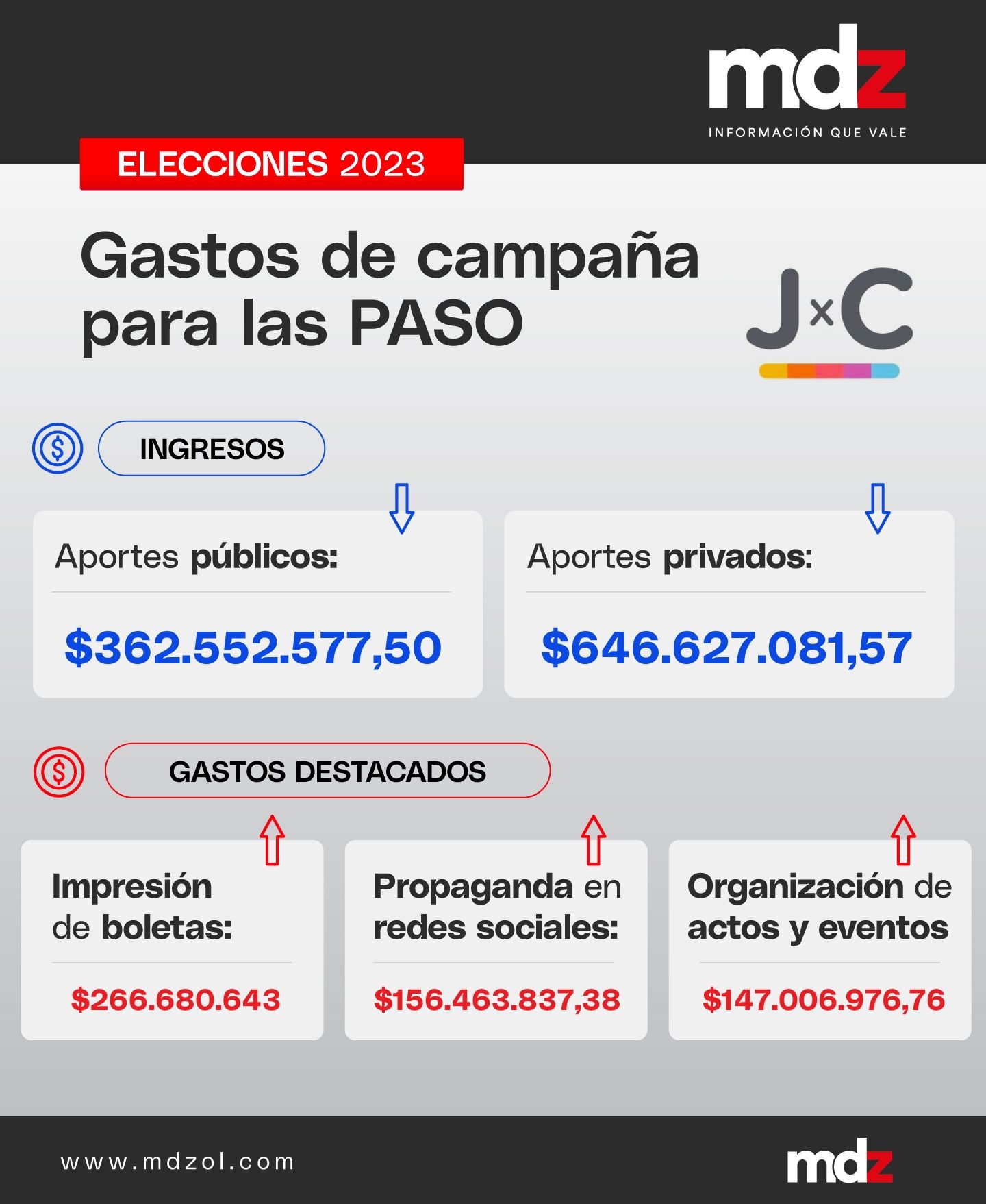 También aparecen gastos destacados en los informes, que detallan hasta los gastos de luz y viáticos. De impresión de boletas, un gasto operativo de campaña, JxC usó $266.680.643; en publicidad en las redes sociales, $156.463.837,38, y en organización de eventos gastaron $147.006.976,78.