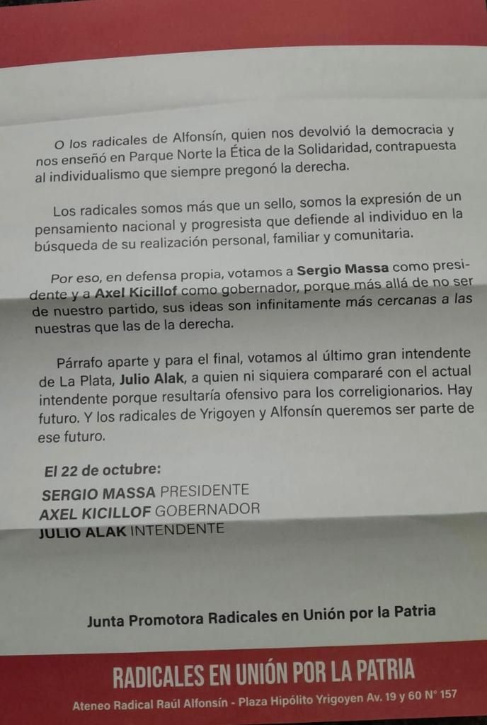 En un párrafo de la misiva advierten que "los radicales somos mas que un sello, somos la expresión de un pensamiento nacional y progresista que defiende al individuo", agregando que "por eso en defensa propia, votamos a Sergio Massa como presidente y a Axel Kicillof como gobernador, porque más allá de no ser de nuestro partido, sus ideas son infinitamente mas cercanas a las nuestras que las de la derecha".