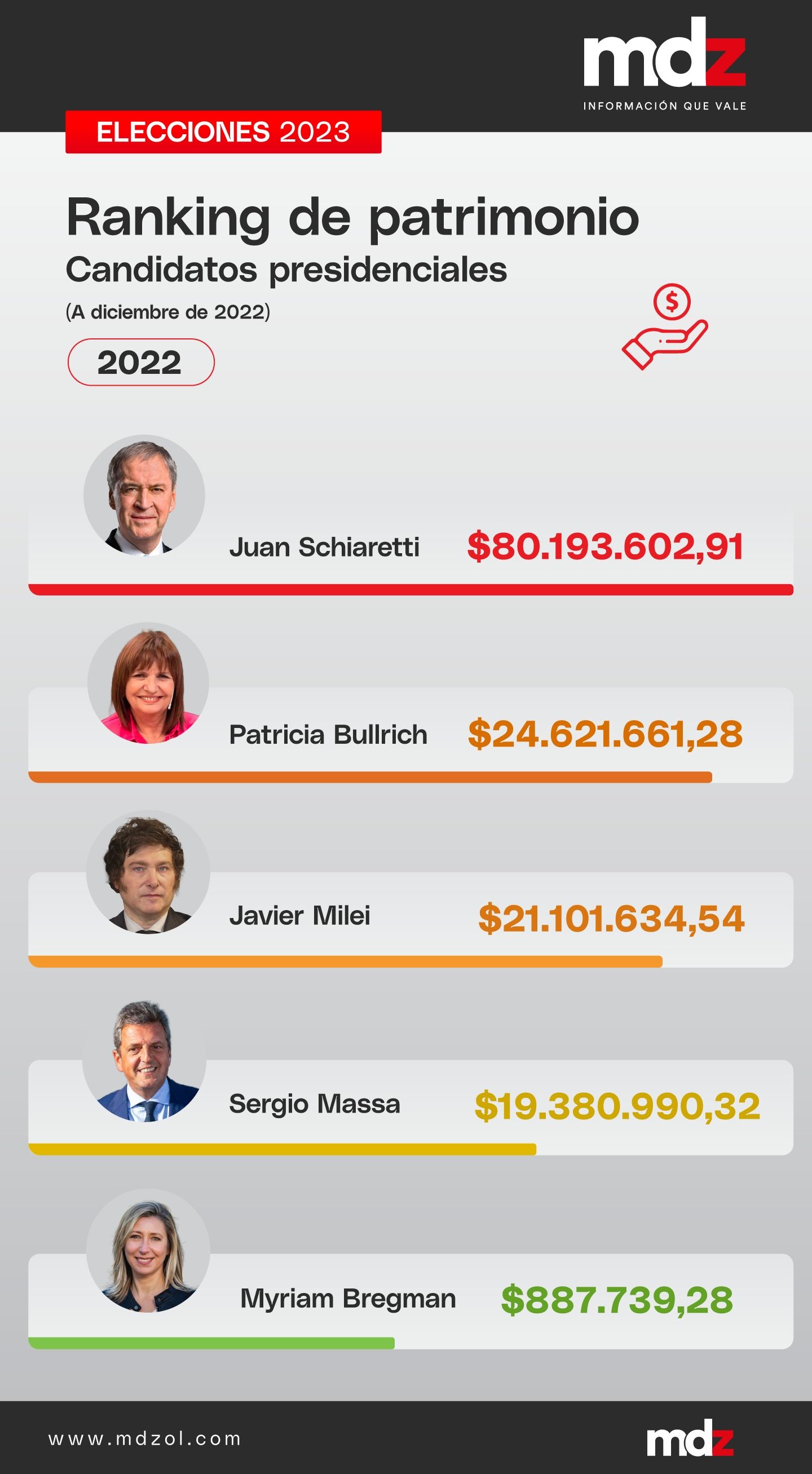 Juan Schiaretti es el candidato a presidente con mayor patrimonio entre bienes, dinero y depósitos y se consagra como quien encabeza el ranking que hizo MDZ para saber cuál de los cinco presidenciables se lleva el primer y último puesto. Según las declaraciones juradas que cada uno presentó ante la Oficina Anticorrupción, correspondientes al período 2022, Schiaretti es el primero, en segundo lugar está Patricia Bullrich, de Juntos por el Cambio; tercero quedó Javier Milei, de La Libertad Avanza; cuarto Sergio Massa, el candidato oficialista y última Myriam Bregman, la referente del FIT.
