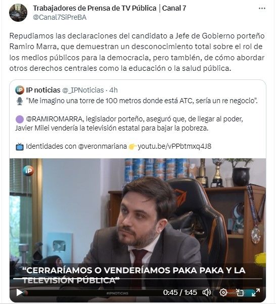 Estos dichos motivaron el enojo de Trabajadores de Prensa de Tv Pública, quienes salieron a repudiar al legislador porteño. "Repudiamos las declaraciones del candidato a Jefe de Gobierno porteño Ramiro Marra, que demuestran un desconocimiento total sobre el rol de los medios públicos para la democracia, pero también, de cómo abordar otros derechos centrales como la educación o la salud pública", sostuvieron en la red social X.
