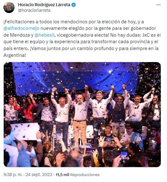 "Felicitaciones a Alfredo Cornejo y Hebe Casado por este triunfo y un abrazo grande a todos los mendocinos que eligieron hoy equipo, experiencia y capacidad de transformar. Otro domingo más demostrando que se puede. Vamos por el país con Patricia Bullrich", añadió la diputada nacional.