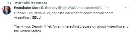 "Gracias, diputado Milei, por esta interesante conversación sobre Argentina y EEUU", posteó el diplomático norteamericano en las redes sociales poco después de la reunión, donde también compartió una foto de ambos dándose la mano.