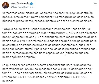 Martín Guzmán calificó como "vergonzoso" el comunicado del Gobierno de Javier Milei por decir que la deuda con el FMI se tomó durante la presidencia de Alberto Fernández.