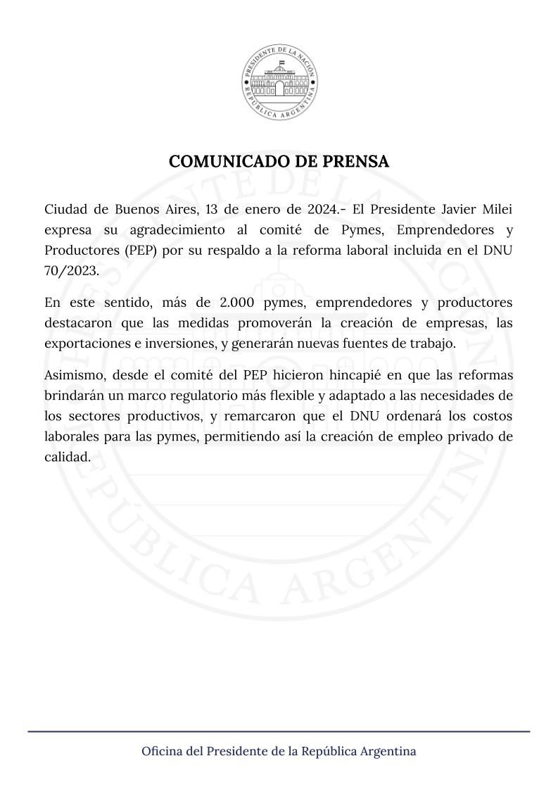 Y destacó que "el Presidente Javier Milei expresa su agradecimiento al comité de Pymes, Emprendedores y Productores (PEP) por su respaldo a la reforma laboral incluida en el DNU 70/2023".