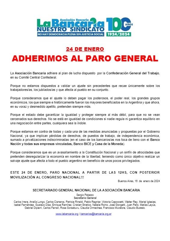 La Asociación Bancaria (AB) anunció en las últimas horas que se suma al paro general convocado por la Confederación General del Trabajo (CGT) para el miércoles 24 de enero, con la finalidad de mostrar su rechazo al Decreto de Necesidad y Urgencia (DNU) impulsado por el presidente Javier Milei.