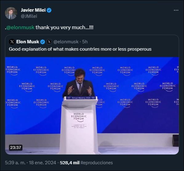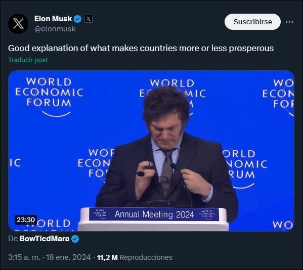 "Buena explicación de lo que hace que los países sean más o menos prósperos", escribió Musk en su cuenta personal X y acompañó su opinión con el video de la exposición realizada este miércoles por el mandatario en la reunión que anualmente convoca a jefes de Estado y empresarios de las finanzas de todo el mundo.