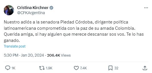 "Nuestro adiós a la senadora Piedad Córdoba, dirigente política latinoamericana comprometida con la paz de su amada Colombia. Querida amiga, si hay alguien que merece descansar sos vos. Te lo has ganado", escribió Cristina Fernández de Kirchner en su cuenta de la plataforma X.