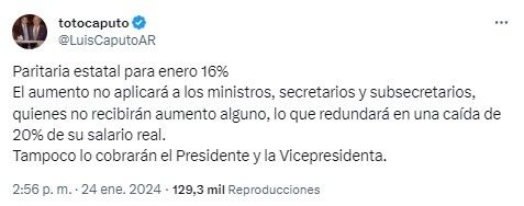 La noticia la dio a conocer mediante su cuenta de red social X, donde señaló que el aumento "no aplicará a los ministros, secretarios y subsecretarios, quienes no recibirán aumento alguno, lo que redundará en una caída de 20% de su salario real".
