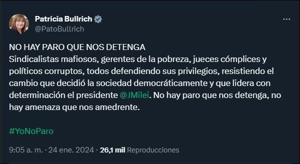 "Sindicalistas mafiosos, gerentes de la pobreza, jueces cómplices y políticos corruptos, todos defendiendo sus privilegios, resistiendo el cambio que decidió la sociedad democráticamente y que lidera con determinación el presidente Javier Milei. No hay paro que nos detenga, no hay amenaza que nos amedrente".