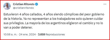 "Estuvieron 4 años callados, 4 años siendo cómplices del peor gobierno de la historia. Ya no representan a los trabajadores solo quieren cuidar sus privilegios. La mayoría de los argentinos eligieron el cambio y no lo van a poder detener".