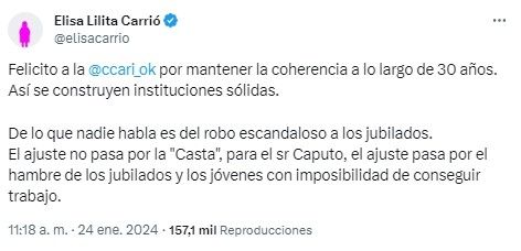 Mediante un mensaje en la red social X, la referente de la Coalición Cívica destacó a su espacio "por mantener la coherencia a lo largo de 30 años" y consideró que "así se construyen instituciones sólidas".