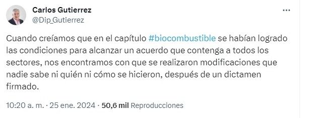 A esto se suma el enojo de Carlos Gutiérrez (HCF), que responde al gobernador Llaryora, porque tampoco plasmaron en el dictamen lo prometido en materia de biocombustibles. "Cuando creíamos que en el capítulo #biocombustible se habían logrado las condiciones para alcanzar un acuerdo que contenga a todos los sectores, nos encontramos con que se realizaron modificaciones que nadie sabe ni quién ni cómo se hicieron, después de un dictamen firmado", expresó en X el diputado.