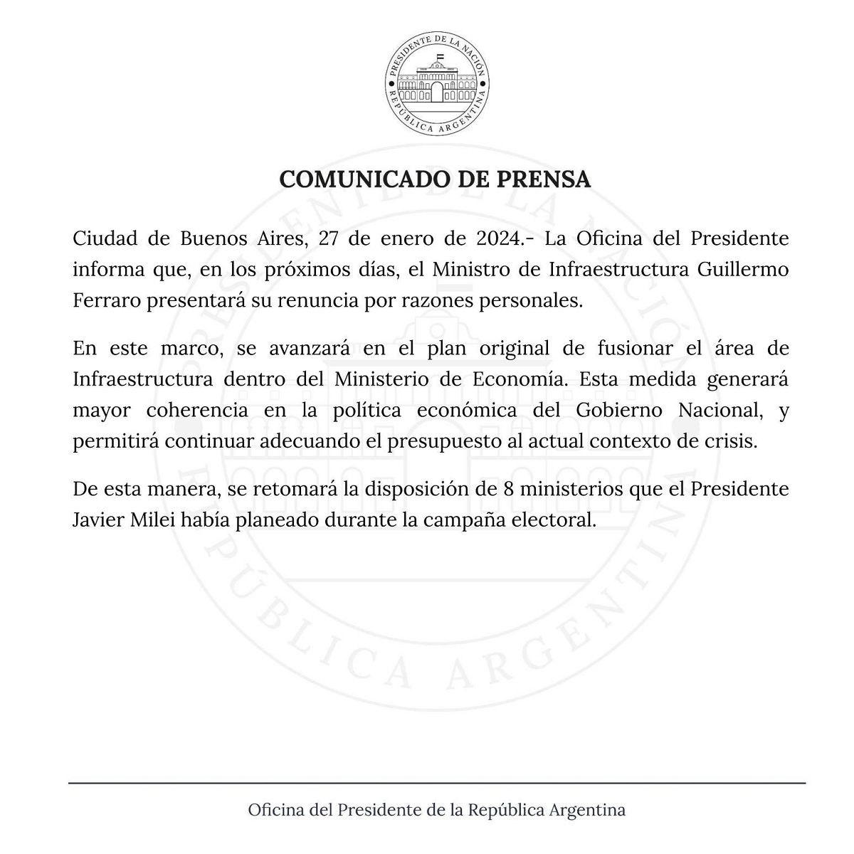 Este sábado, y ya sabiéndose que Infraestructura pasará a la órbita del ministerio de Economía comandado por Luis Caputo, el Gobierno emitió un comunicado donde informan que "en los próximos días" el ministro "Guillermo Ferraro presentará su renuncia".